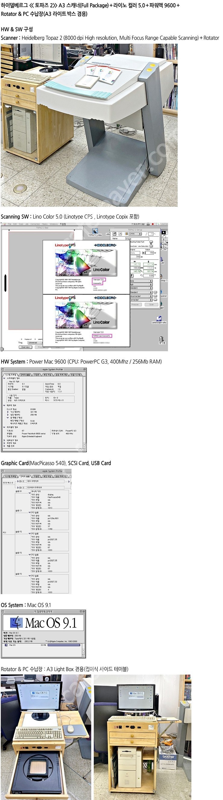 토파즈2 스캐너(하이델베르그)+라이노 컬러 5.0+파워맥 9600 판매합니다.
